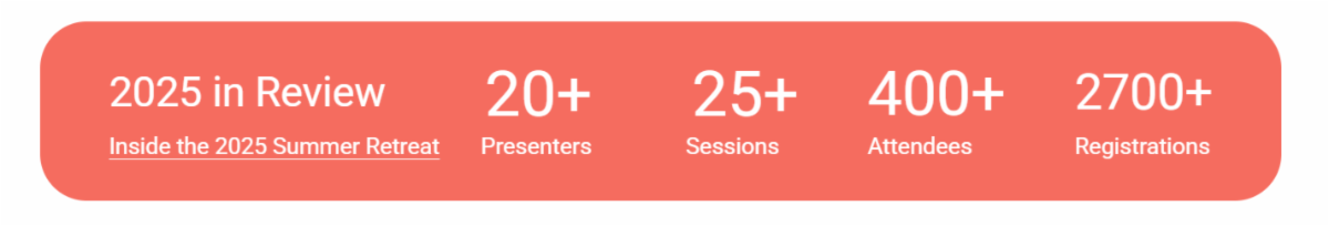 Last year, the 2025 Summer Retreat marked new highs for registration and attendance, welcoming more than 400 virtual attendees and generating 2,740 session registrations across 26 offerings. We hope to reach even more this year!